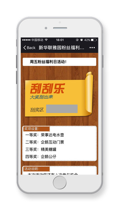 內(nèi)蒙古呼和浩特新華聯(lián)雅園樓盤開盤前宣傳項(xiàng)目活動(dòng)之一刮刮樂活動(dòng),一系列線上活動(dòng)為該公眾號(hào)在一個(gè)月內(nèi)收入了10W的粉絲關(guān)注量,一期樓盤一銷而空。