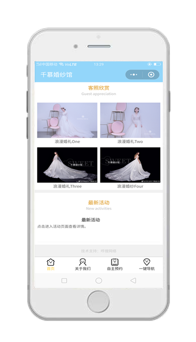 千慕婚紗館微信小程序,用戶可以直接在平臺自主預(yù)約和查看圖片,呼搜網(wǎng)從策劃到開發(fā)上線全程提供服務(wù)。