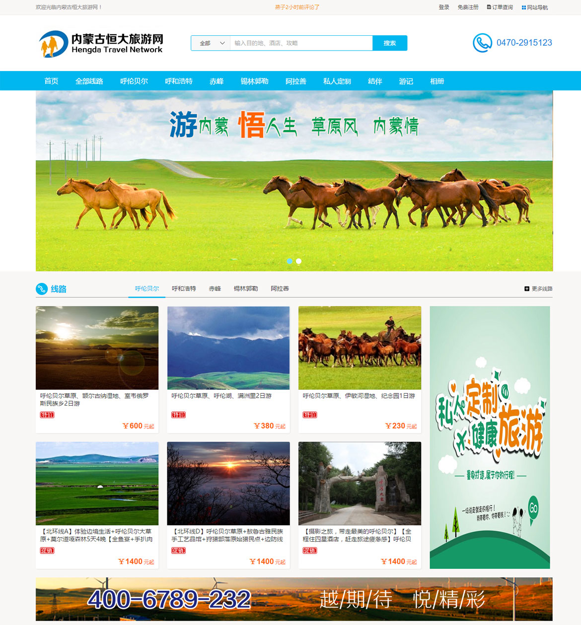 內(nèi)蒙古恒大旅游公司官方微網(wǎng)站,用戶可以直接在微信平臺(tái)預(yù)定各類旅游路線、景點(diǎn)、酒店、租車。并且有呼倫貝爾、呼和浩特、赤峰、錫林郭勒、阿拉善等多個(gè)站點(diǎn)支持。用戶可以直接在微信平臺(tái)付款購(gòu)買該網(wǎng)站的任何旅游產(chǎn)品,支持微信支付、支付寶支付等多種主流支付方式,呼搜網(wǎng)從策劃到開發(fā)上線全程提供服務(wù)。